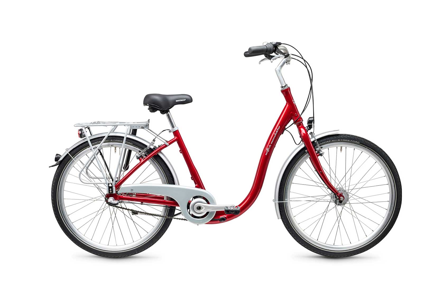 Unsere TANTE KÄTHE bietet nicht nur einen extratiefen Einstieg für müheloses Auf- und Absteigen, dank des flachen Sitzrohrwinkels ist auch die Aufsitzhöhe deutlich niedriger als bei einem konventionellen Citybike. Dadurch muss man nicht an jeder Ampel vom Rad springen, sondern bleibt sicher mit beiden Füßen auf dem Boden. Das garantiert Sicherheit bei „Stop and Go“. Robuste und bewährte Komponenten wie die 7-Gang-Nabenschaltung mit Rücktritt, LED-Beleuchtung und einen verstellbaren Vorbau. Kettenschutz, Schutzbleche und Gepäckträger runden die Vollausstattung ab.